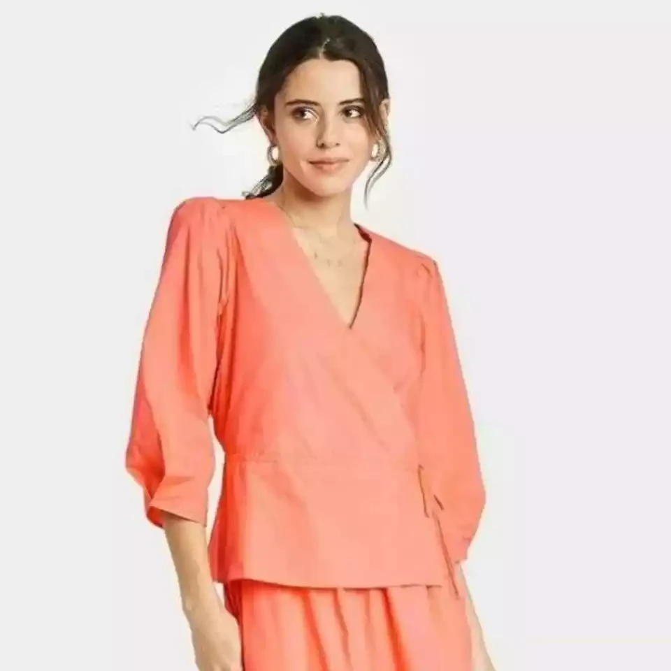 A New Day Womens Wrap Top Orange Sleeve V Neck Drawstring Waist